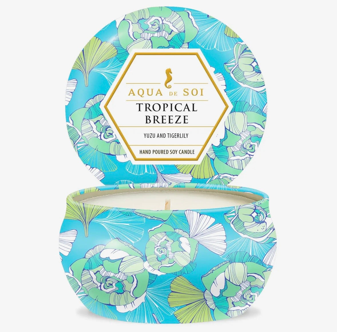 Tropical breeze 9oz soy wax tin candle. Infused with notes of yuzu and tiger lily. Hand poured in California.