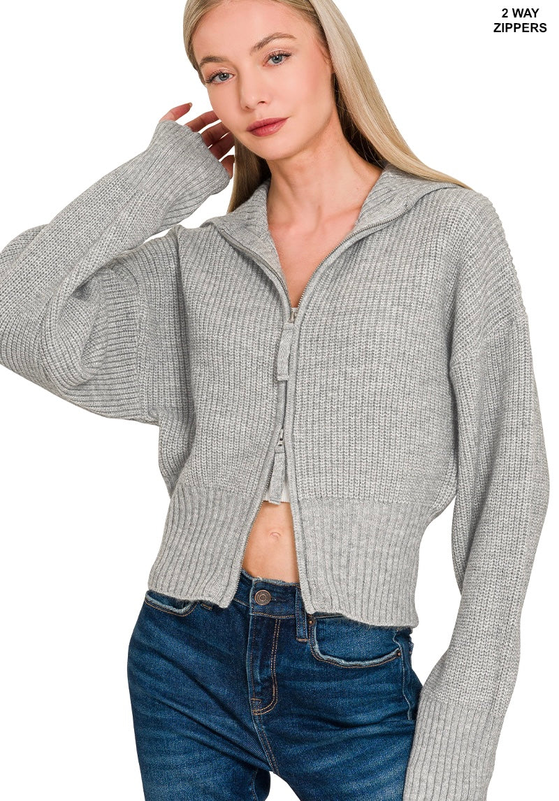 Cozy heather gray sweater with double zipper feature & collar. Both cozy and chic, this piece makes for the  perfect colder weather wardrobe staple.